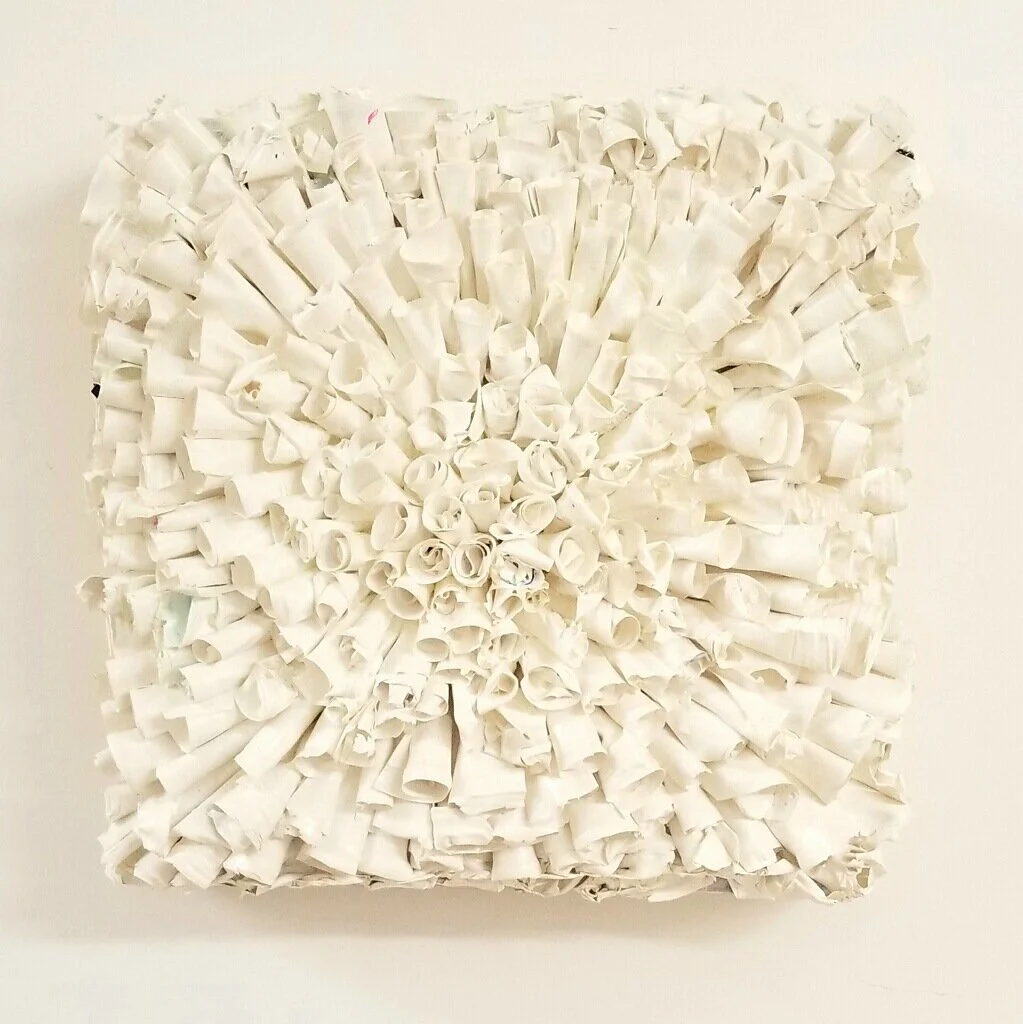 Kate Bae utilizes her grid to make the quietest work in the show, a rolled and folded paint object that reads more like a strange flower garden than an abstraction. Each hand-crafted roll sits carefully nested with the next creating a lush vibration in the all white composition. Mel Prest utilizes her offset grids as warm embraces, locating their sources more in op art and the process of touching the surface than in the severity of the grid. Each work vibrates more like neon Californian Bridget Riley than something inert, rigid.
